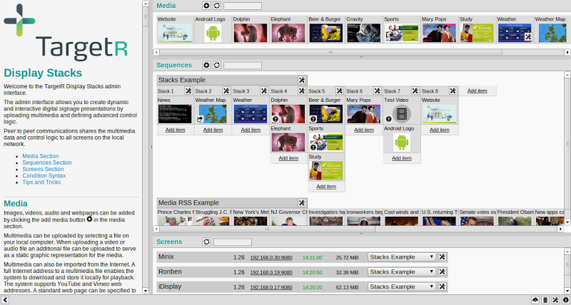 Relevant and dynamic multimedia presentations require more than simple date and time scheduling. TargetR Stacks unlock new possibilities because both logic and data can be modified in real time automatically. It is finally possible to display an ice cream advert between June and September when the temperature is above 25 degrees centigrade, ice cream is in stock and the screen is within one mile of the beach. The stacking concept and the powerful administration interface sets Display Stacks apart from traditional solutions typically restricted to playlists and simple scheduling.
