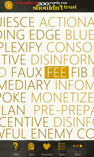 Such bubbling paranoia necessitates an app which confronts hollow business jargon such as granularity and cloud computing, reality-denying military terms such as friendly fire and surgical strike, property-improving descriptors such as compact and bijou. This app also challenges a pic’n’mix selection of words employed in prose in an attempt to make the writer appear clever, such as quixotic and veritable, although they frequently sound awkward when voiced aloud in everyday speech. So, a veritable treasure trove awaits!