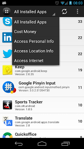 Ever wondering what permissions your favorite apps require? Install our App Permissions, one app to reveal them all!App Permissions is a FREE tool to show the permissions for all the installed apps and system apps on your Android device, without requiring any permission. You can easily find out what apps can cost your money (e.g. calling phone numbers, sending SMSs, etc.), access your personal data (e.g. contacts, calendar, etc.), location data, access Internet, etc.