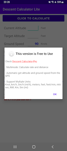 Airplane Descent Calculator Lite le permite calcular la distancia en la que el avión debe comenzar el descenso para obtener la altitud deseada, con relación a una tasa de descenso específica (velocidad vertical), y velocidad respecto al suelo (velocidad horizontal).
