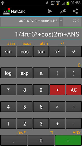 Calculator that lets you enter full expressions.During entering your expression, a red/green bar indicates wheter your formula is complete or not.