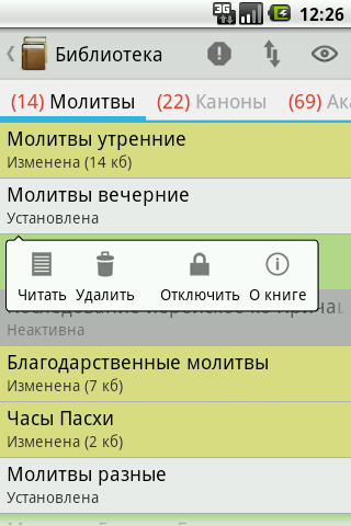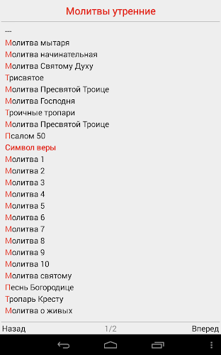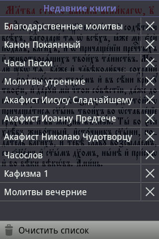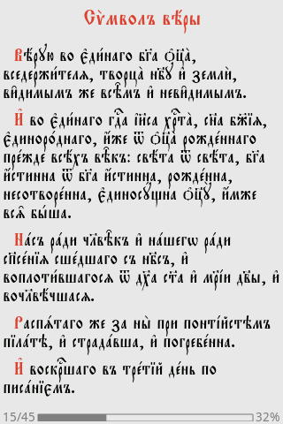 Приложение позволяет просматривать тексты различных книг на церковно-славянском языке. Книги загружаются с удаленного сервера и сохраняются на SD карте устройства для последующего чтения в режиме "оффлайн".По сравнению с предыдущей версией проделана огромная работа по улучшению интерфейса. Учтены пожелания пользователей: упрощена навигация по текстам книг, добавлено удобное содержание и список истории просмотра. Добавлена возможность создания закладок, указывающих на произвольное место книги. Удалены громоздкие и ненужные элементы интерфейса, а также сделано много других приятных изменений.