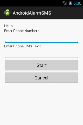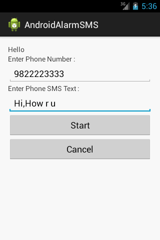 (1)In AlarmSms Activity launch they are show 2 edit text 1st enter a number &2nd Text .(2)then enter a no & text,click button start sms can send this no &show toast message u r cell.click cancel button cancel the message. show toast message.