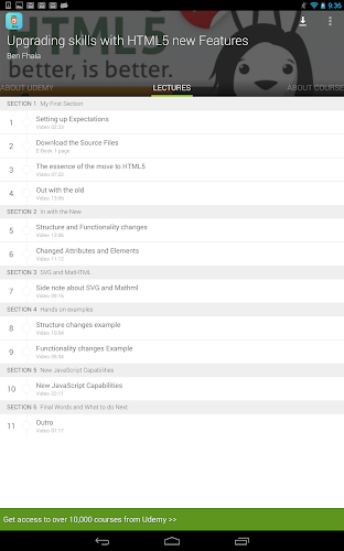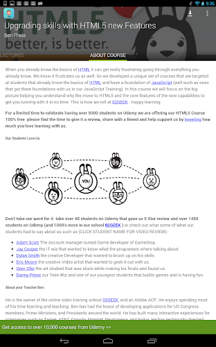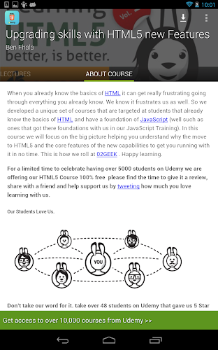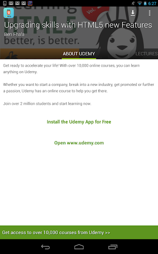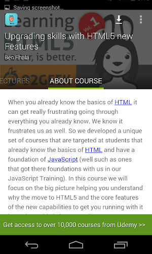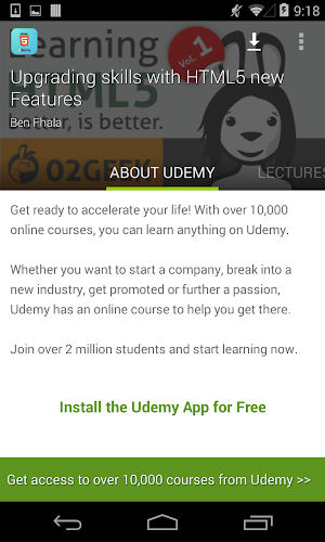 Android App Analysis And Review: Free HTML5 Learning by Udemy, Desenvolvido Por Udemy. Listado Na Categoria Educação. A Versão Atual É 1.9, Atualizada Em 11/11/2017 . De Acordo Com Os Usuários, Avaliações No Google Play: Free HTML5 Learning by Udemy. Alcançados Sobre Instalações 1,000. Atualmente, O Free HTML5 Learning by Udemy Possui 4 Críticas, Classificação Média De 3.0 Estrelas