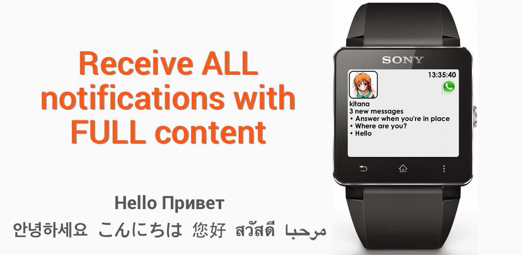 This app will notify your Sony SmartWatch 2 by ALL notifications with FULL content!Features: