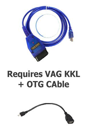 Hardware Requirement: See photo. USB Host on your device, Vag KKL (FTDI Driver), OTG Cable and optional 20 pin to 16 pin Adapter.