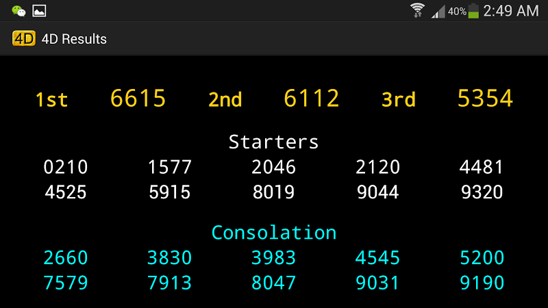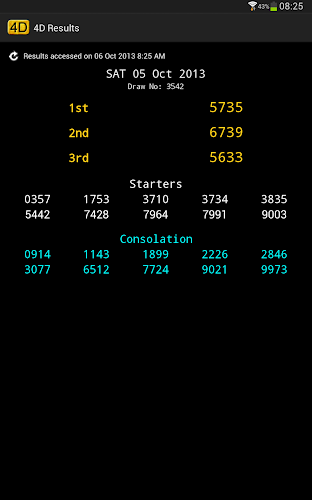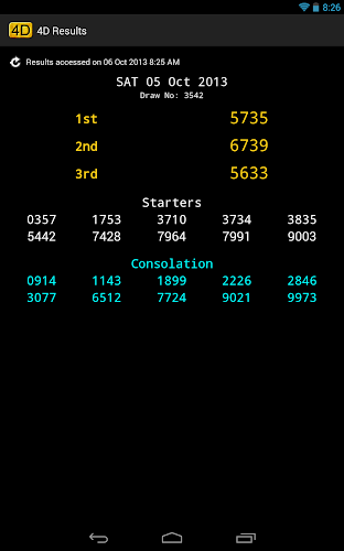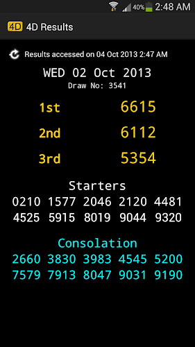 This app just displays the latest results for Singapore 4D.It should be especially useful for those making the switch from teletext (hence the teletext theme).