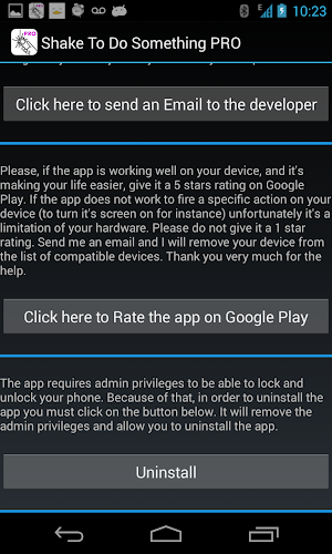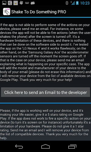 Unfortunately, on some devices the app will not be able to fire actions when the user shakes the phone after the screen is turned off. It's a hardware limitation of these devices, and there is nothing that can be done on the software side to avoid it. For instance, I've tested the app on the 'LG Nexus 4' and it works flawlessly; on the other hand, on the 'Samsung Galaxy Ace' the accelerometer sensors are turned off the moment the screen goes off. If that is the case on your device, please send me an email (there is a button on the app to do it) explaining what is happening on your specific case.