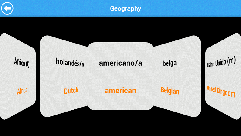 Denna innovativa app har vackra flashkort med coverflow -vy som kan ses antingen av spanska till engelska eller engelska till spanska .