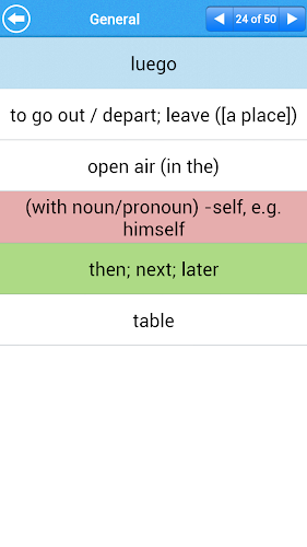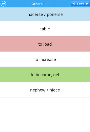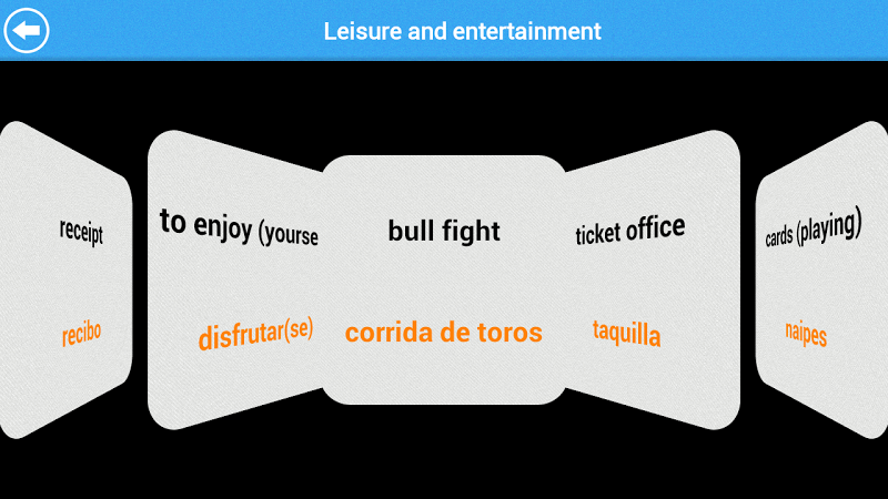 Denna innovativa app har vackra flashkort med Coverflow View som kan ses antingen av spanska till engelska eller engelska till spanska.