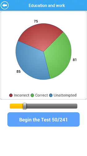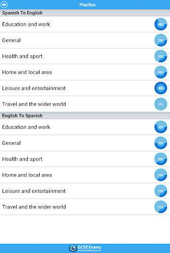 Du kan testa dig själv i Vocab med intelligent utformat frågesystemet. Alla ord kategoriseras i ämnen. Övningsmodulen gör att du kan reagera felaktigt besvara frågor eller frågor som du inte har tagit upp ännu. I slutet av varje test kan du se poängen och granska dina svar. Pajdiagrammet visar dina nuvarande framsteg.