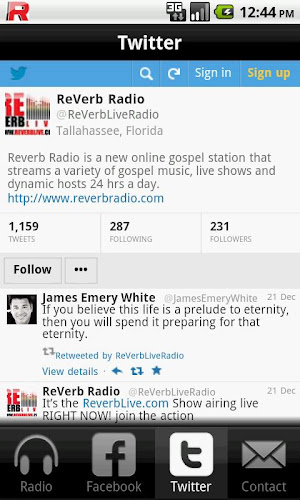 reverb radyo ağı, teşvik edici, eğlenceli ve bilgilendirici gospel müziği ve kaliteli programlar sunmak için sosyal ağları ve mobil medyayı kullanan, dinleyici destekli bir çevrimiçi gospel istasyonudur. İstasyonumuz, her yaşa ve türe uygun çeşitli kentsel gospel müziği, ritim ve övgü ve çağdaş müzik çalmaktadır. rrn, çabalarını yalnızca Tallahassee bölgesindeki genç profesyonellere değil, ruhsal olarak gelişmek isteyen herkese odaklıyor.Şu Anda 1.0 Sürümünü Sunuyoruz. Bu En Son, En Optimize Edilmiş Versiyonumuz. Birçok Farklı Cihaz Için Uygundur. Ücretsiz Indir, Google Play Store'dan Veya Barındırdığımız Diğer Sürümlerden Doğrudan Apk. Ayrıca, Kayıt Olmadan Indirebilirsiniz Ve Giriş Gerekmez.