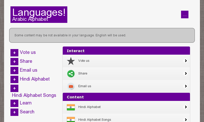 Hindi Alphabet (the app) is part of a learning project which contains apps to learn different alphabets and languages such as English, German, Russian, Arabic, Hebrew, Thai, Chinese, Persian, Japanese, Korean, Hindi, and other Asian languages.