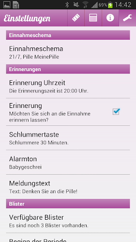 - Tägliche Erinnerung an die Pilleneinnahme mit frei wählbarer Erinnerungszeit
