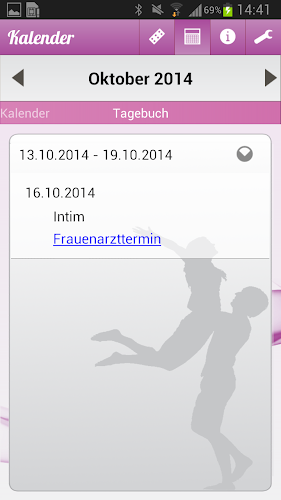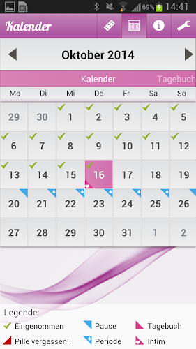 - Kalender und Tagebuch mit Infos über Zyklusverlauf, Regelbeschwerden, Tagesstimmung und Intimtage