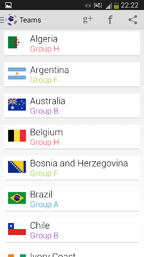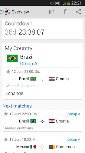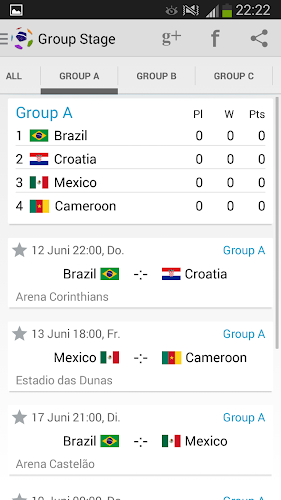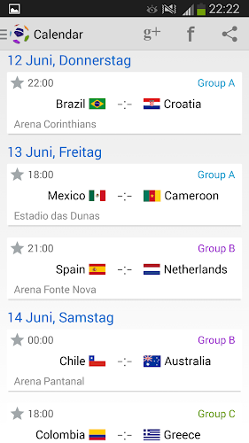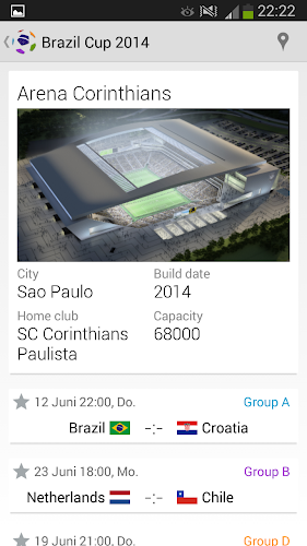 该移动应用程序可让您通知您在巴西举行的2014年FIFA足球世界杯。它还可以洞悉世界杯历史,并详细介绍了参与的足球队和球员。选择您喜欢的游戏,您会收到有关这些比赛开始的通知。使用此应用程序,您可以收到实时结果,以及当前的排名和团队统计数据。甚至更重要的是,该应用还包含倒计时,时间表和有关体育场及其位置的信息。freation: